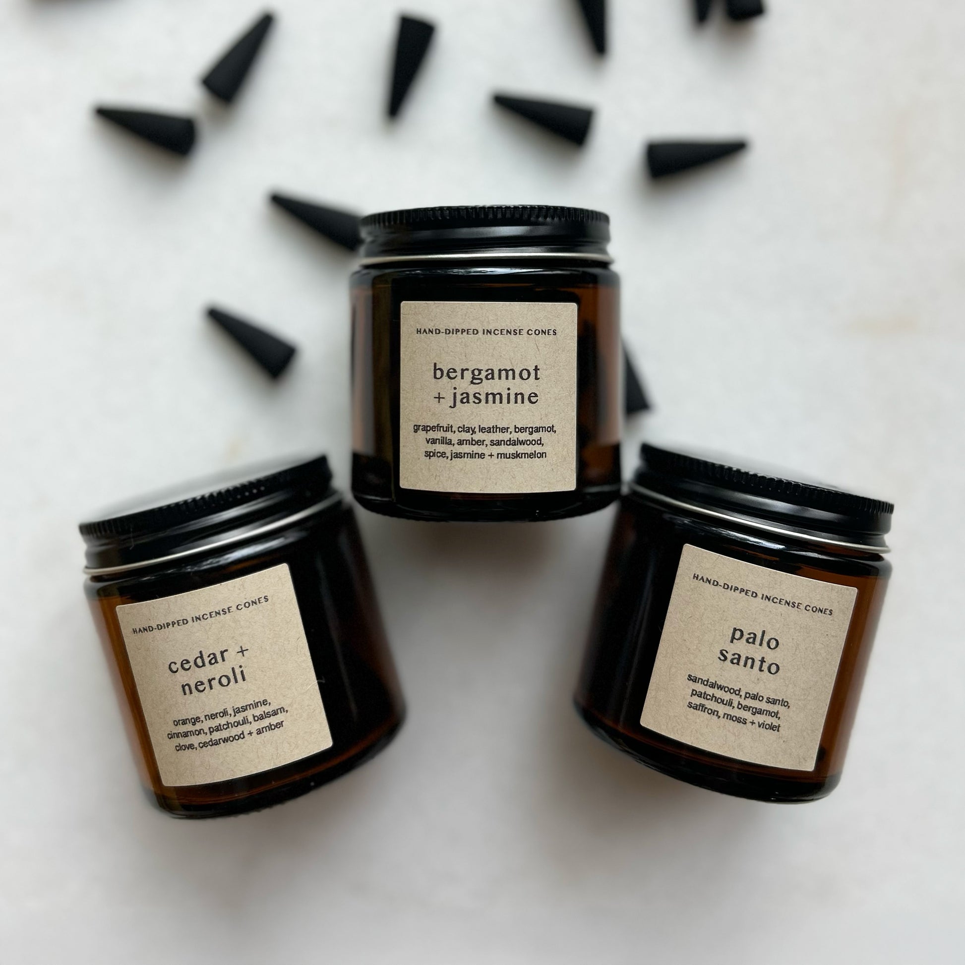 Natural charcoal incense cones made from joss tree and bamboo, scented with premium fragrance, essential oils, and dipropylene glycol, stored in an air-tight and recyclable or reusable glass jar with metal screw top lid